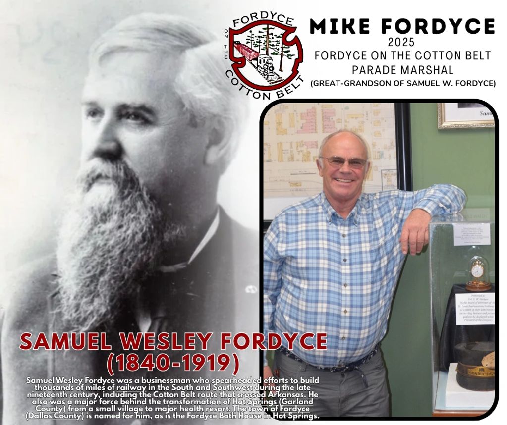 Mike Fordyce, great-grandson of Samuel W. Fordyce which Fordyce was named after, is the 2025 Fordyce on the Cotton Belt Parade Grand Marshall.